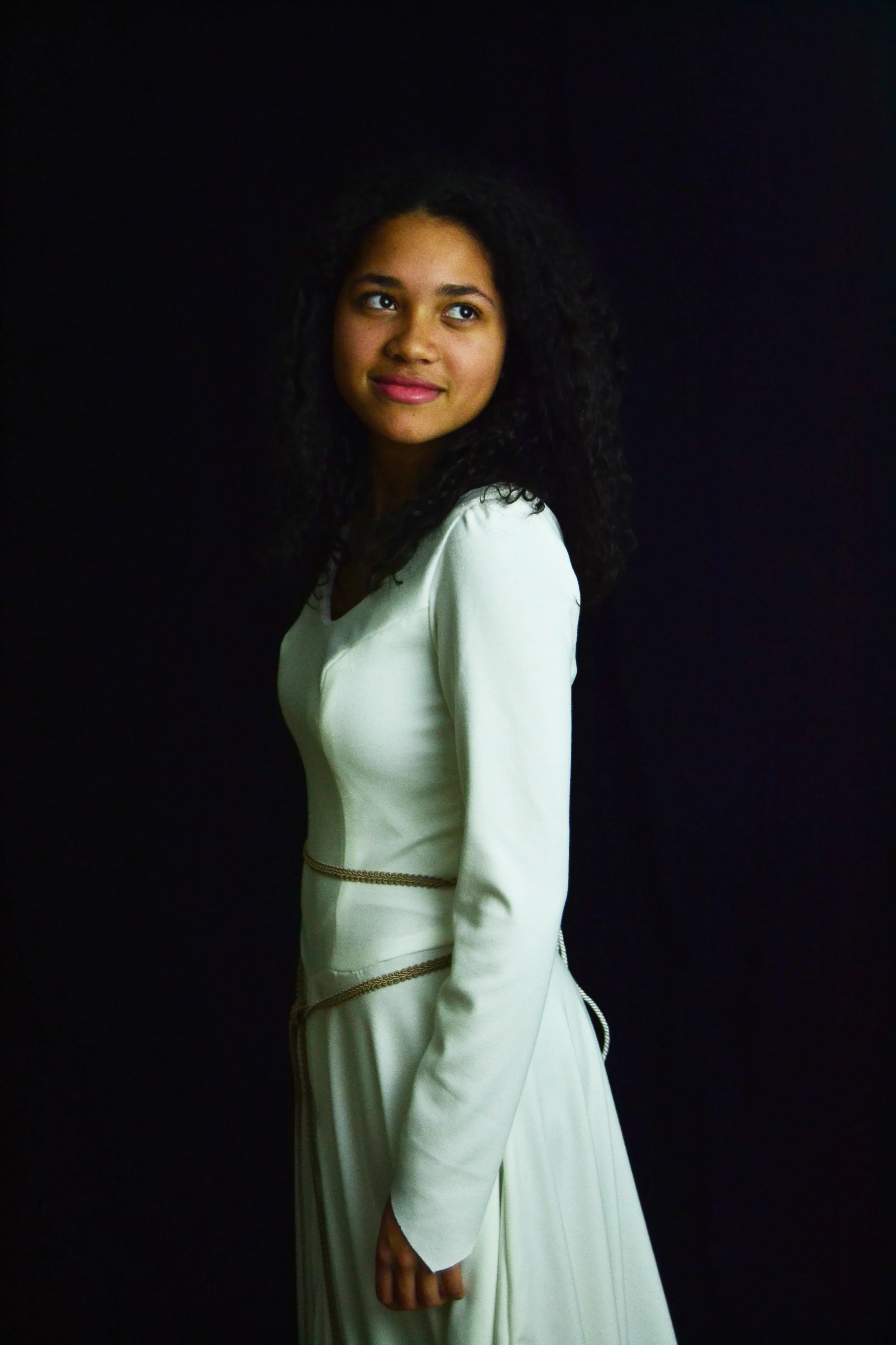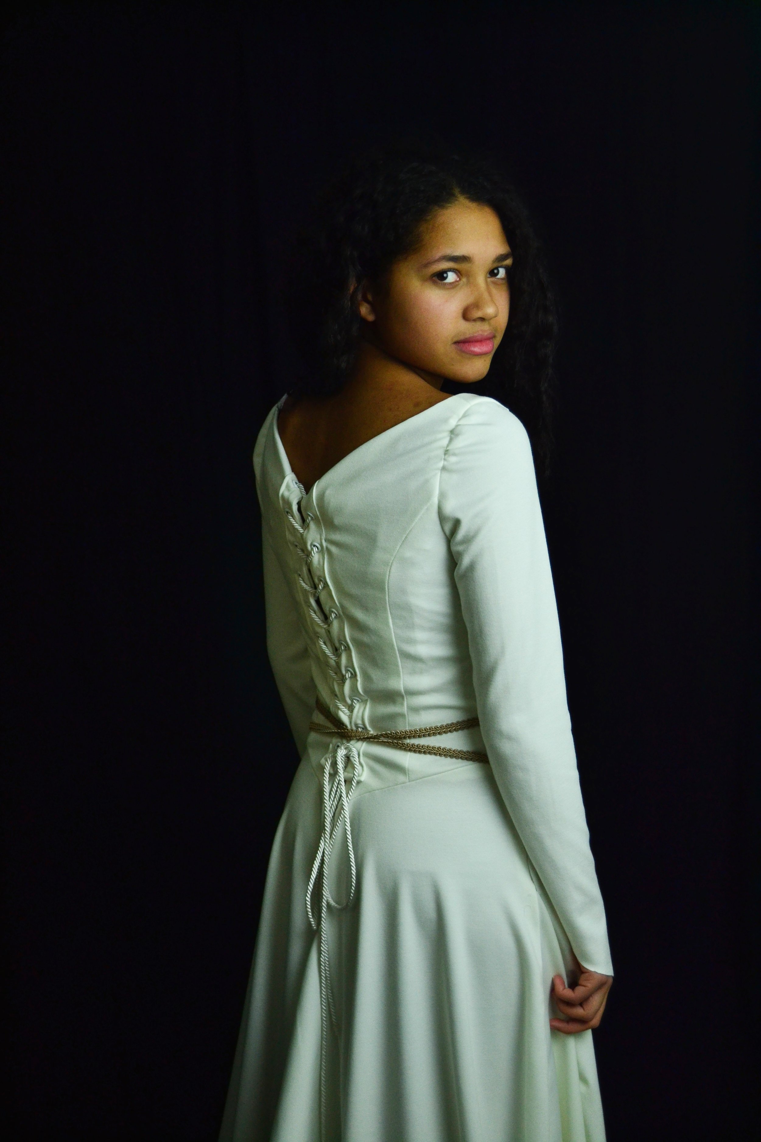 White fabric was chosen to symbolize innocence and purity. The fitted bodice emphasizes traditional femininity, while the fuller skirt evokes a princess-like quality, reinforcing the archetype’s association with youth and passivity.