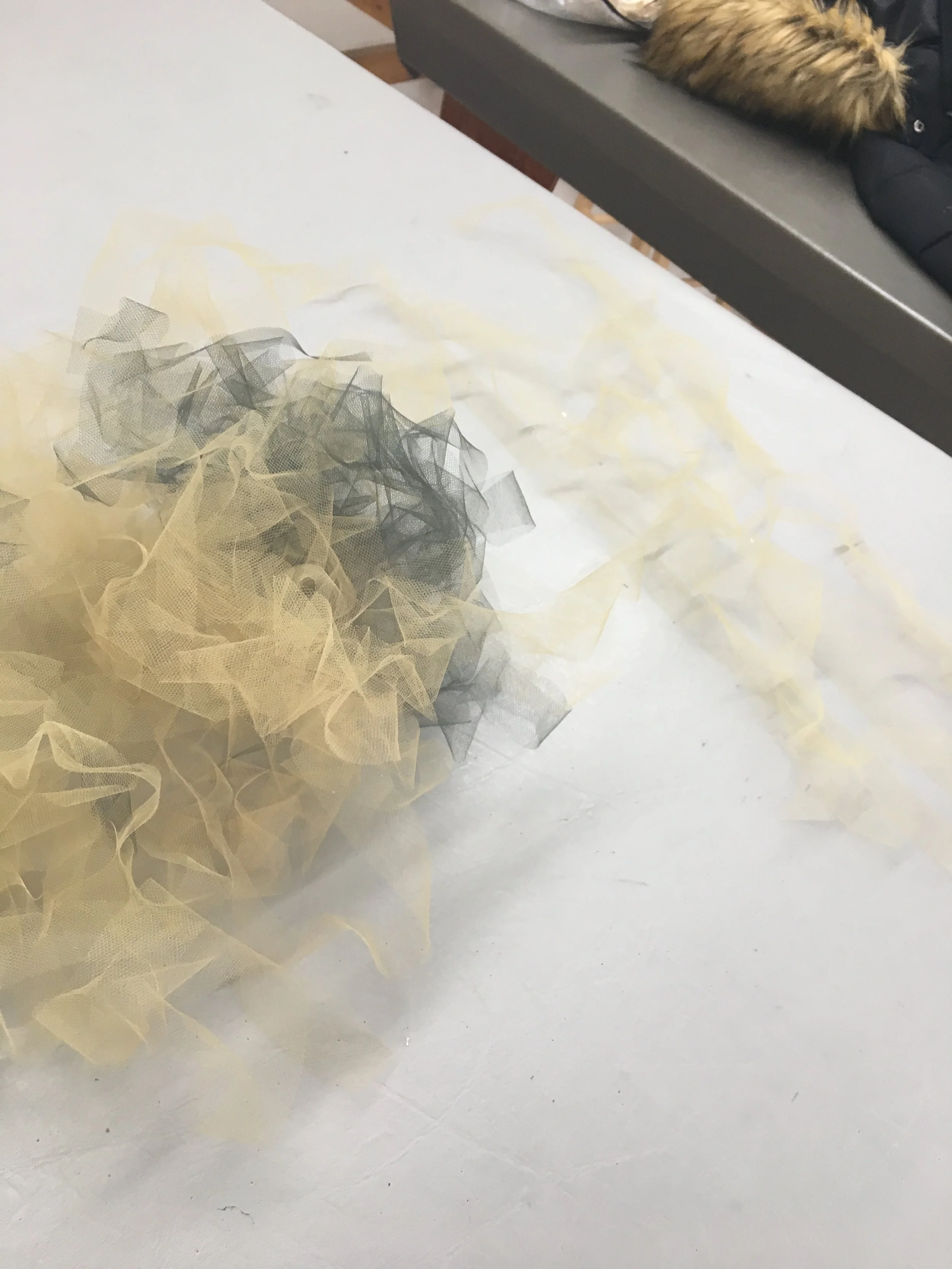 I began with a strand of ribbon and a piece of tulle that I sewed together. Then each strand was finger rolled to form a curl.