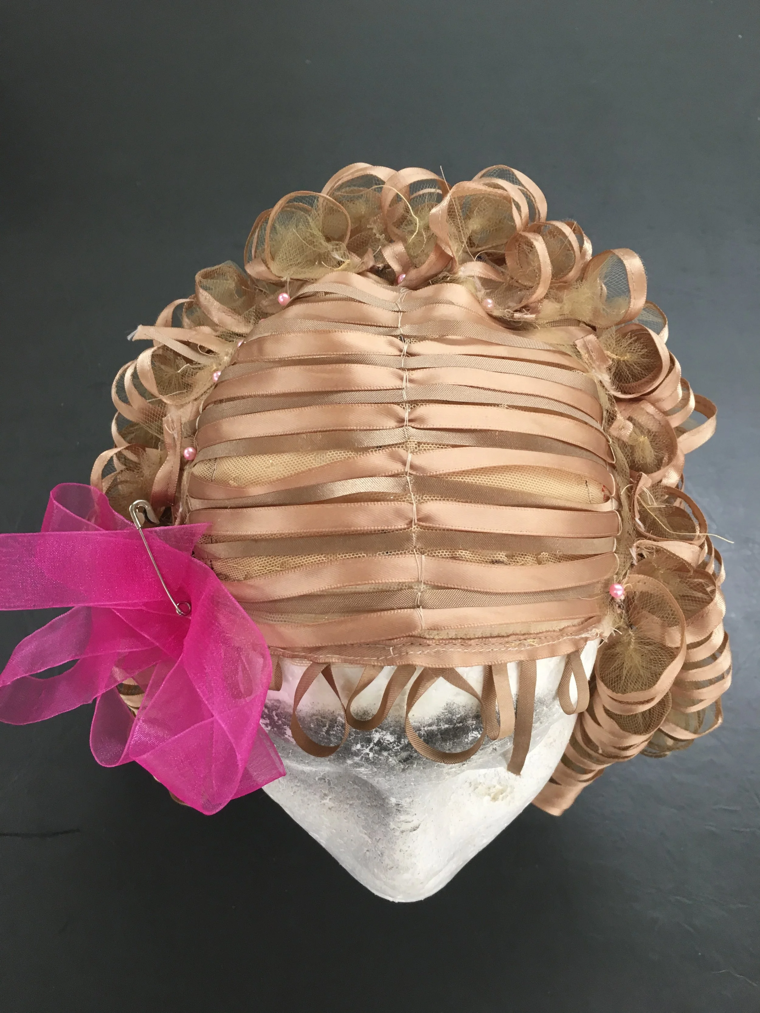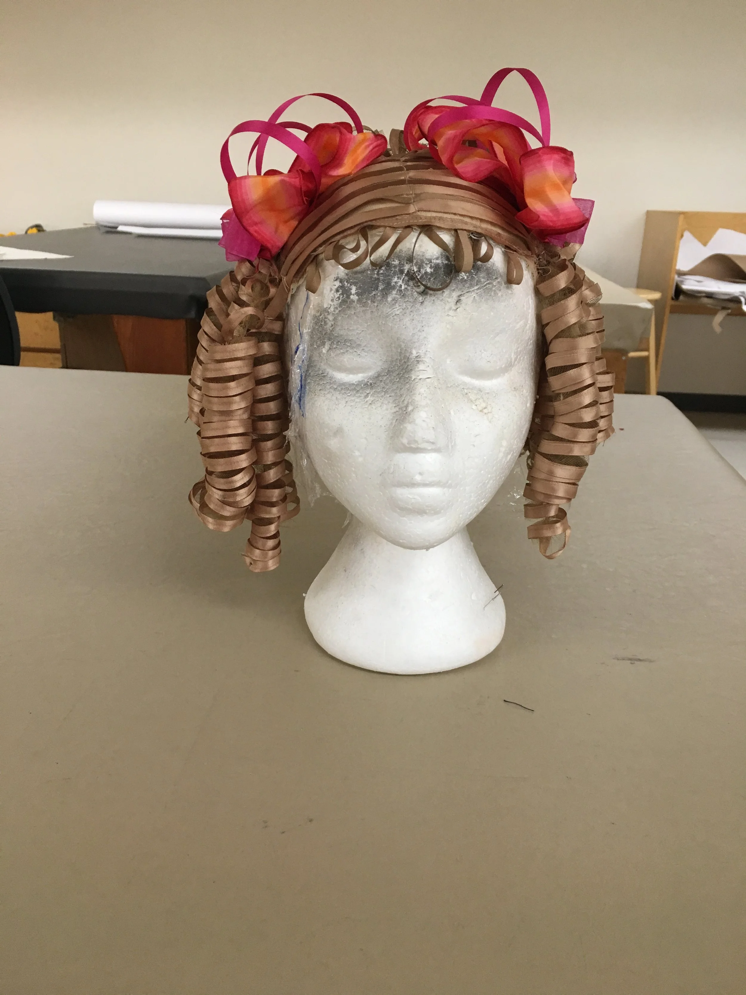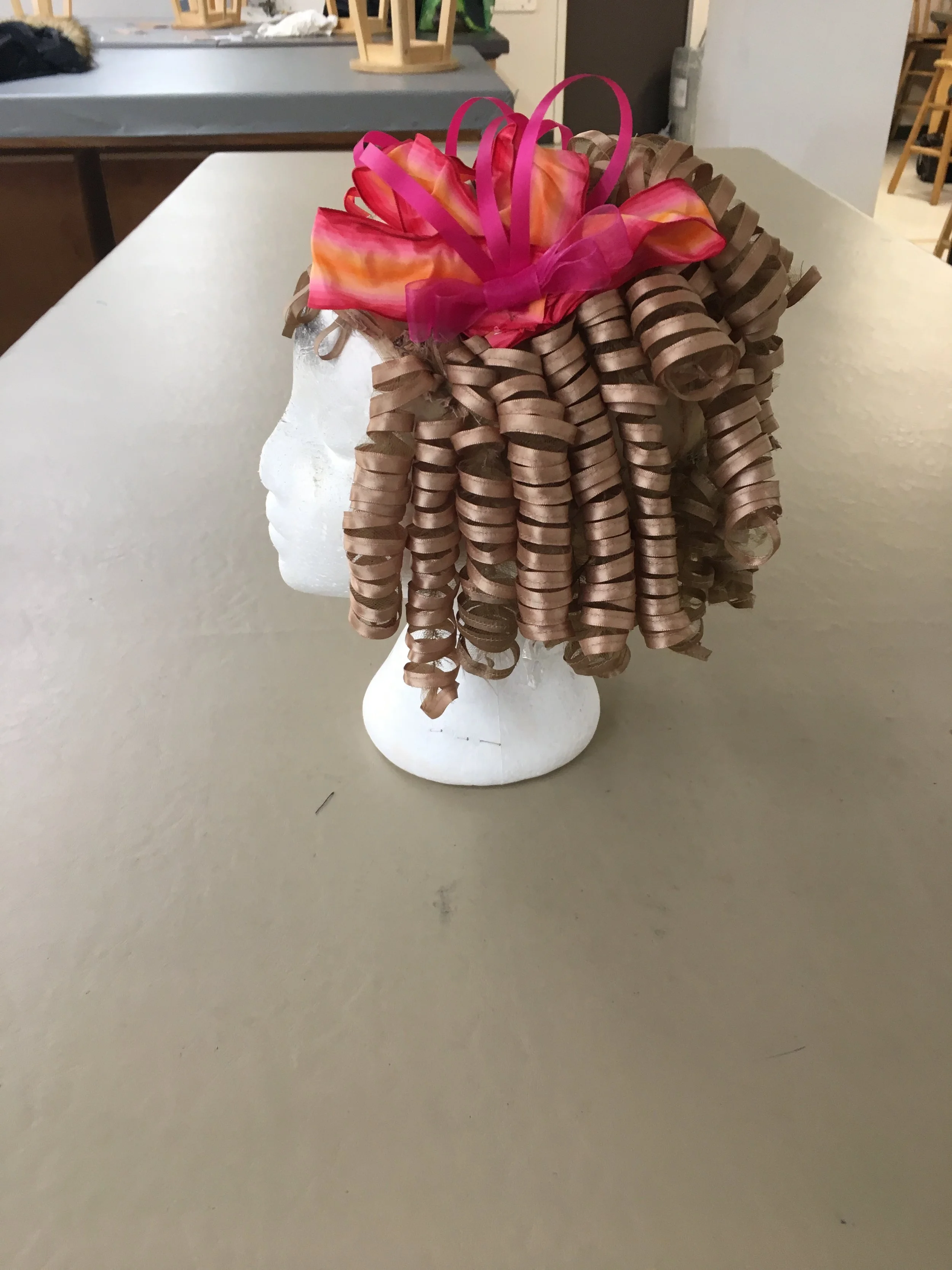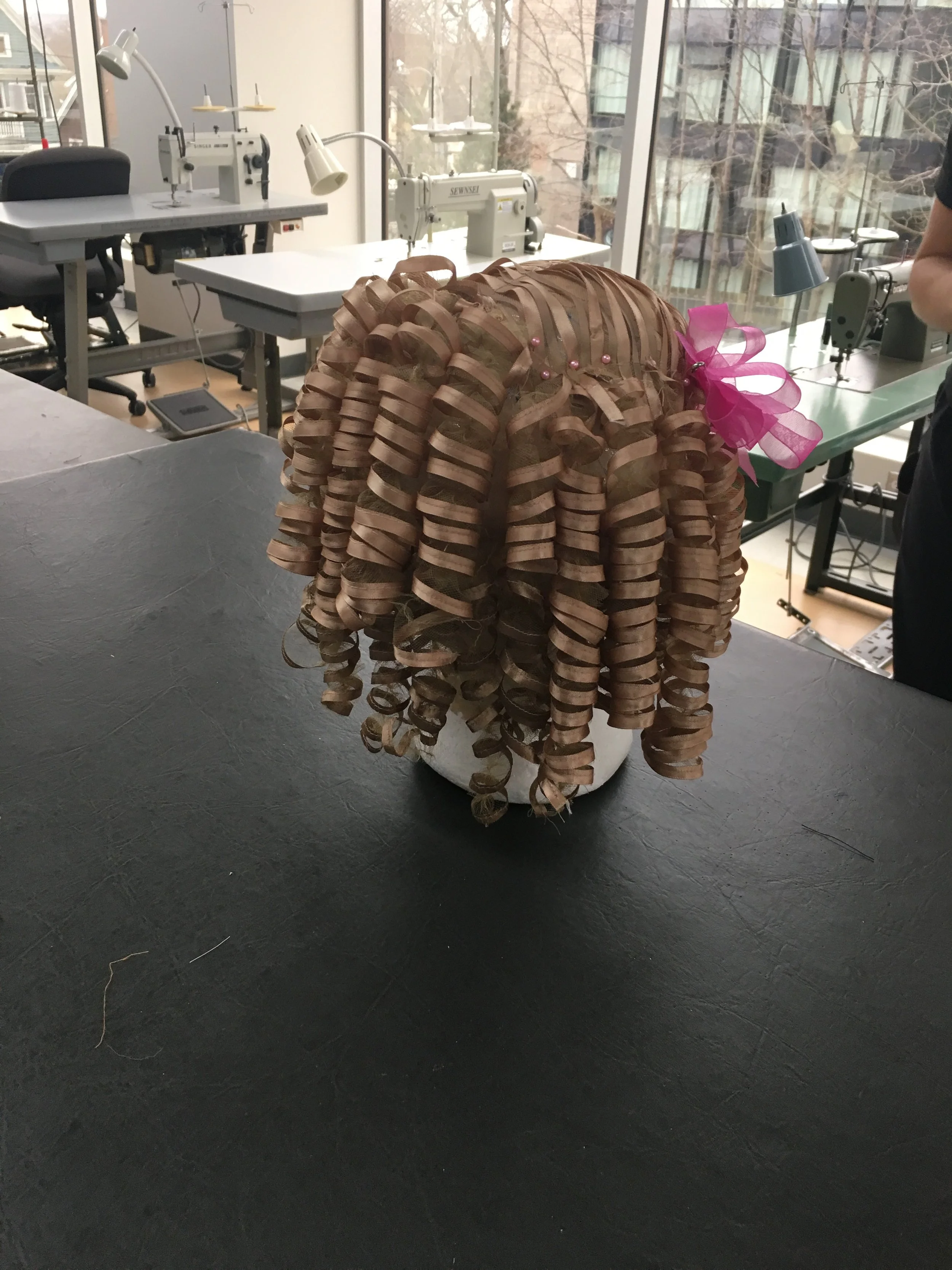 Each row of curls was then hand sewn onto a mesh cap.
